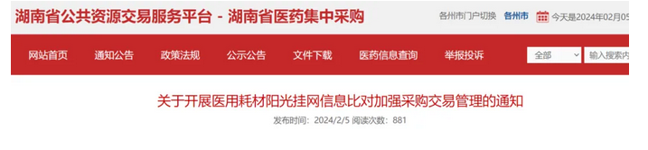 此前,湖南省医保局发布了《关于开展医用耗材阳光挂网信息比对加强采购交易管理的通知》,要求所有公立医疗机构全量比对医保招采管理系统挂网,与原市州平台低值耗材挂网价格、实际交易价格(含线下采购交易价格)信息。违者企业将停止产品挂网并纳入信用评价。