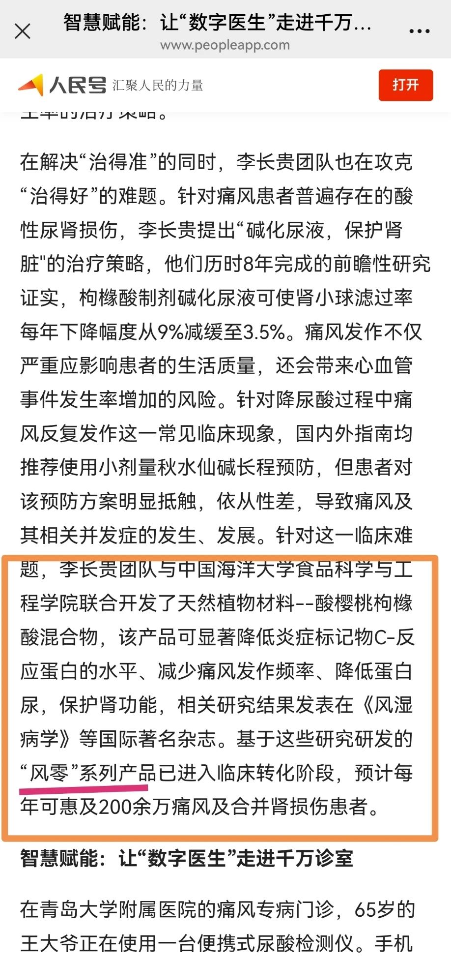 并与哲成生物和中国海洋大学联合研发了天然植物材料--酸樱桃柠檬酸混合物,该产品针对高尿酸痛风人群,不仅有助于尿酸健康,还可显著降低炎症标记物C-反应蛋白的水平、减少痛风发作频率、降低蛋白尿,保护肾功能、改善代谢综合征组分,相关研究结果发表在《风湿病学》等国际著名杂志。基于这些研究研发的“风零”系列产品已进入临床转化阶段,预计每年可惠及200余万痛风及合并肾损伤患者。