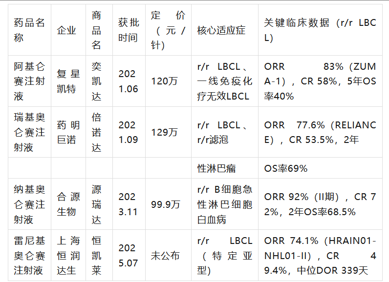 国内已上市的CD19 CAR-T产品共4款,雷尼基奥仑赛需与复星凯特、药明巨诺、合源生物等企业竞争。以下为核心竞品对比: