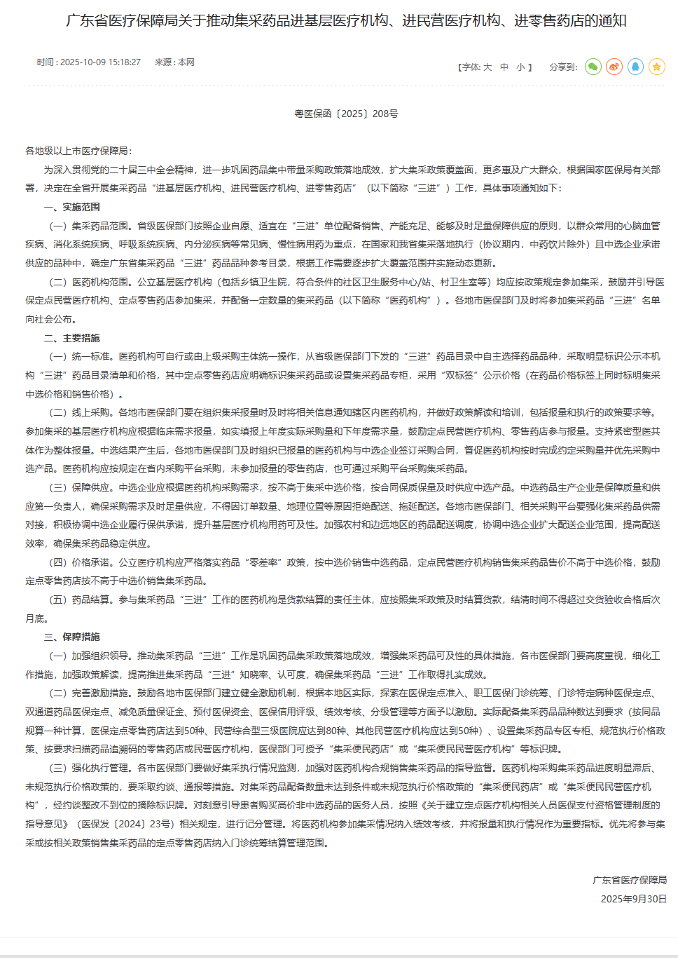 10月9日,广东省医疗保障局突然发布重磅通知,宣布在全省启动集采药品“三进”工作——进基层医疗机构、进民营医院、进零售药店。这意味着广东人以后买常见病、慢性病药可能更便宜、更方便。
