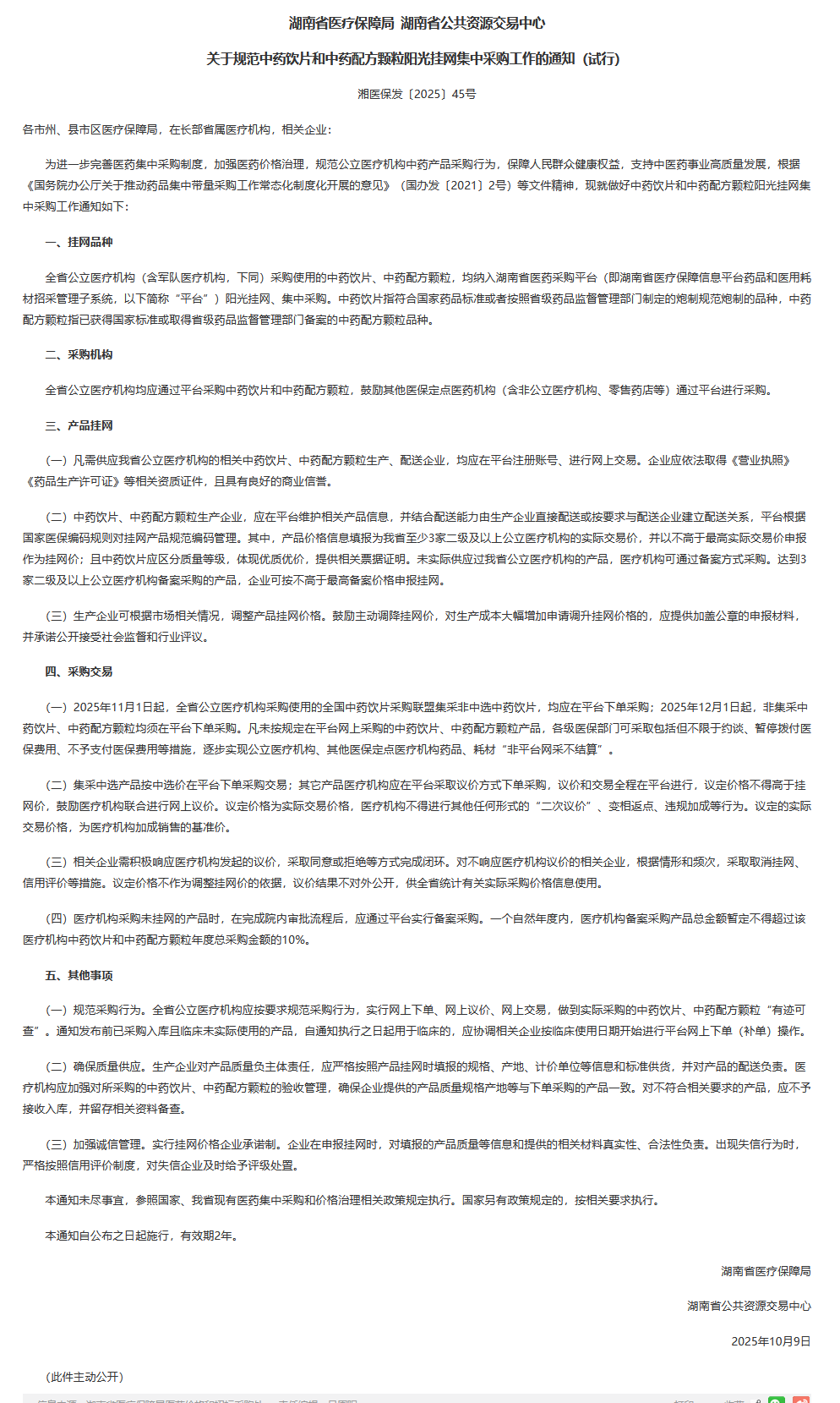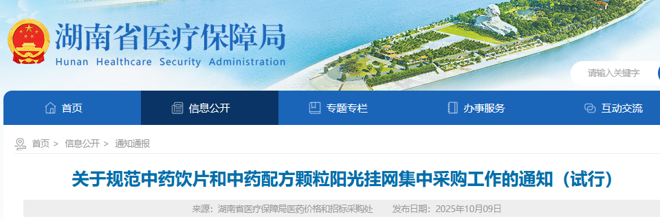 湖南省医疗保障局与公共资源交易中心近日联合发布通知,自2025年10月10日起,全省公立医疗机构中药饮片和配方颗粒采购将全面纳入阳光挂网平台,旨在规范采购流程、保障药品质量、促进中医药产业高质量发展。