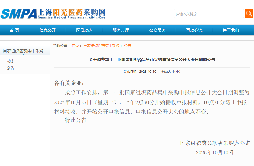 10月10日 紧急通知!第十一批国采申报信息公开大会延期,新日期定为 10 月 27 日!