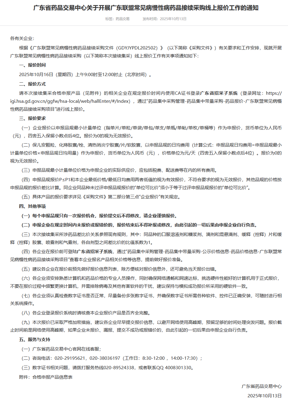 近日,广东省药品交易中心突然发布紧急通知,广东联盟常见病慢性病药品接续采购线上报价工作将于10月16日上午9点正式启动!留给企业准备的时间已不足48小时,这场涉及保儿安颗粒、化痔胶囊等上百种常见病用药的市场争夺战,正进入最紧张的倒计时阶段。所有合格申报企业必须在3小时窗口期内完成报价,一旦操作失误将直接失去竞标资格。