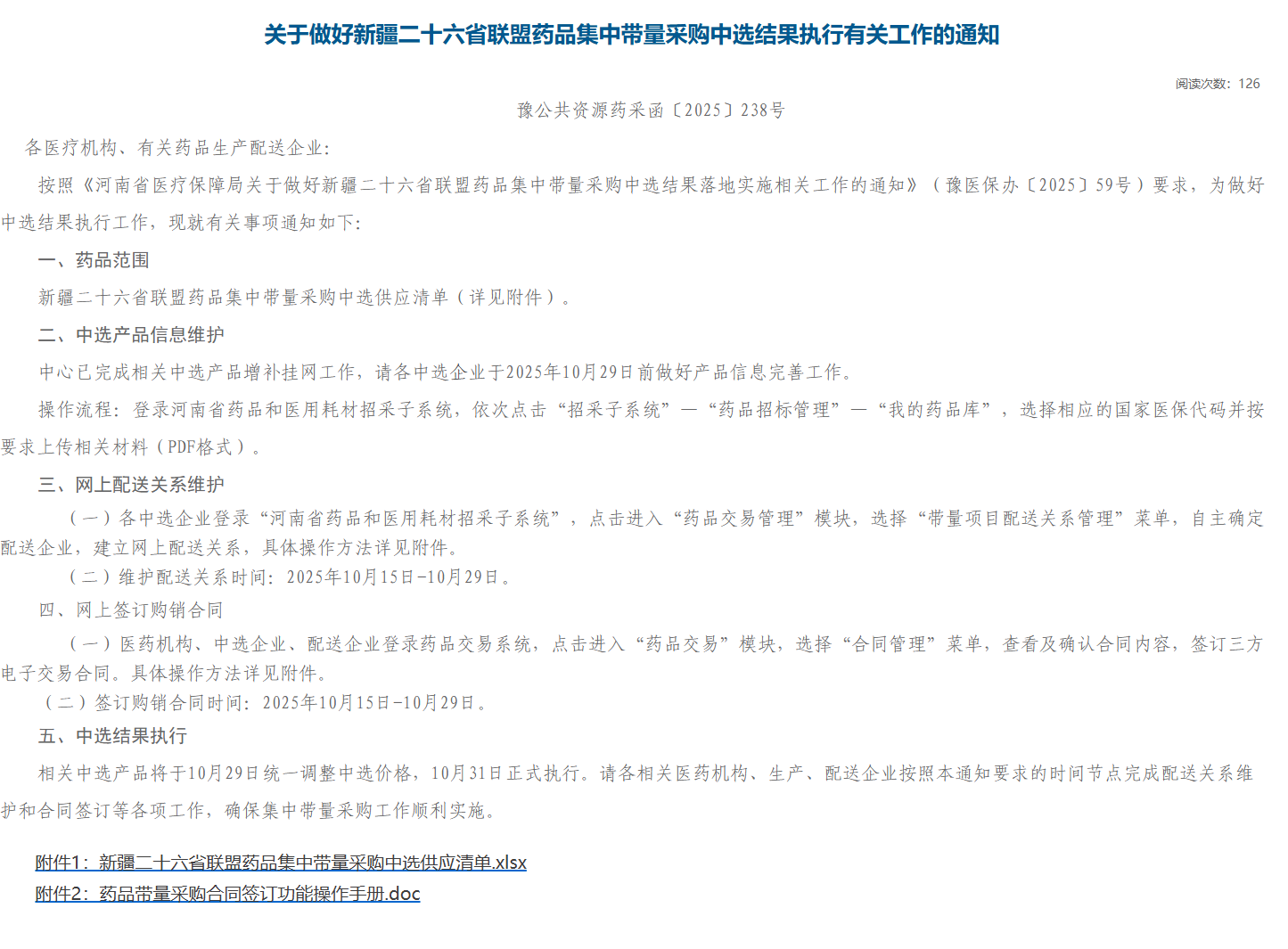 根据通知要求,此次集采覆盖的药品范围以《新疆二十六省联盟药品集中带量采购中选供应清单》为准(详见附件)。目前河南省药品和医用耗材招采子系统已完成中选产品增补挂网工作,所有中选企业必须在10月29日前登录系统,通过"招采子系统—药品招标管理—我的药品库"路径,选择对应国家医保代码并上传PDF格式证明材料,完成产品信息完善工作。这一环节直接关系到后续价格调整和采购执行,企业需确保信息准确无误。