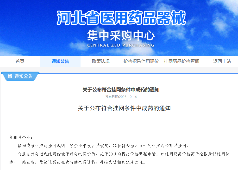 近日,河北省医保局突然发布《关于公布符合挂网条件中成药的通知》,瞬间点燃行业神经。这份看似常规的挂网公告,实则暗藏两大"生死条款":外省价格更低时企业必须30天内申请调价,若高于全国最低价直接取消挂网资格并按失信处理。中成药企业的河北市场争夺战,正演变成与时间赛跑的价格生死战。