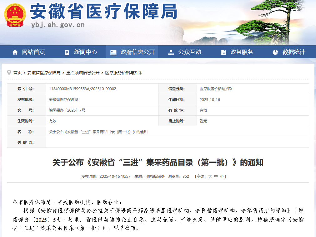 2025年10月16日,安徽省医疗保障局正式发布重磅通知,《安徽省“三进”集采药品目录(第一批)》已按程序确定并向社会公布。这是继国家组织药品集中带量采购之后,地方层面首次将集采药品的覆盖范围延伸至基层医疗机构、民营医疗机构和零售药店三大终端,引发医药行业和公众的广泛关注。