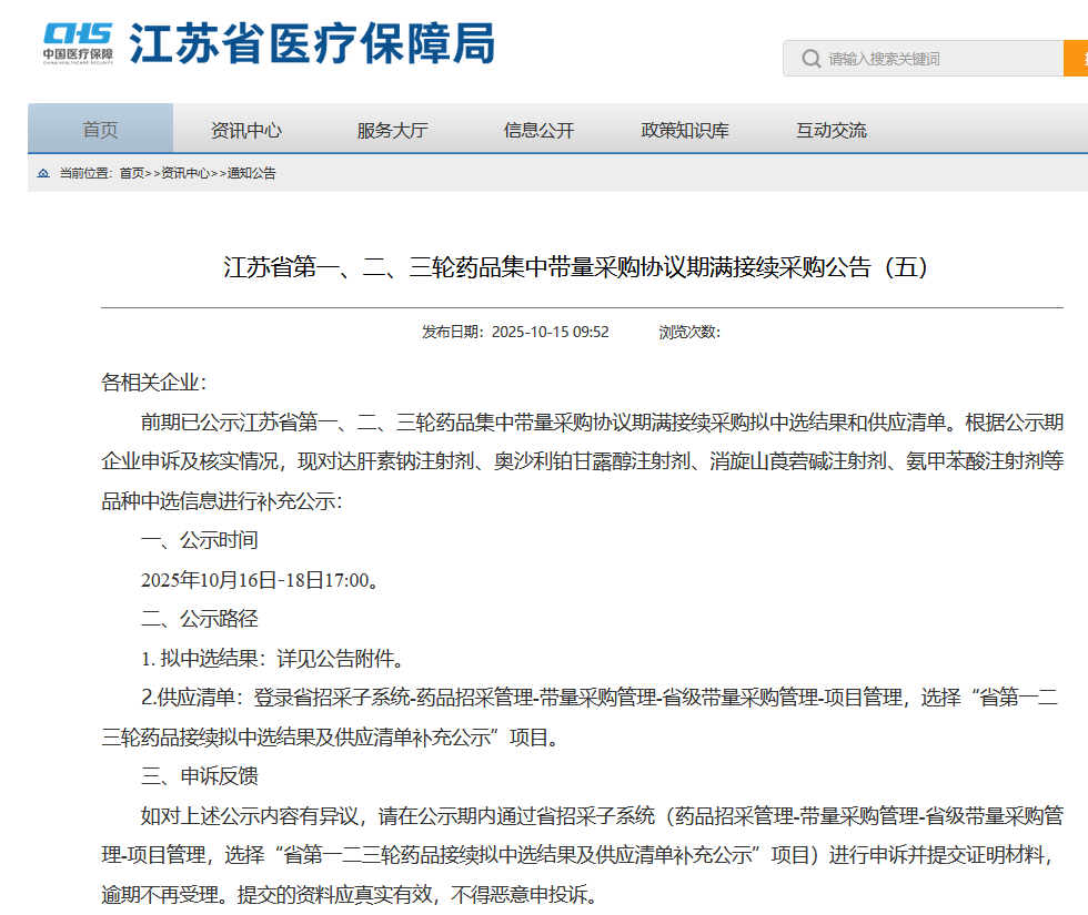 江苏省药采中心突然发布重磅公告!涉及达肝素钠、奥沙利铂甘露醇等4个常用注射剂品种的集采接续结果迎来补充公示,留给企业的申诉时间仅剩72小时。