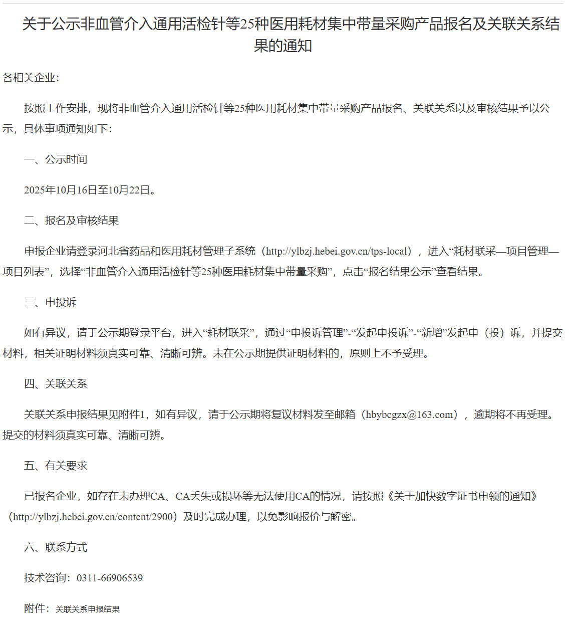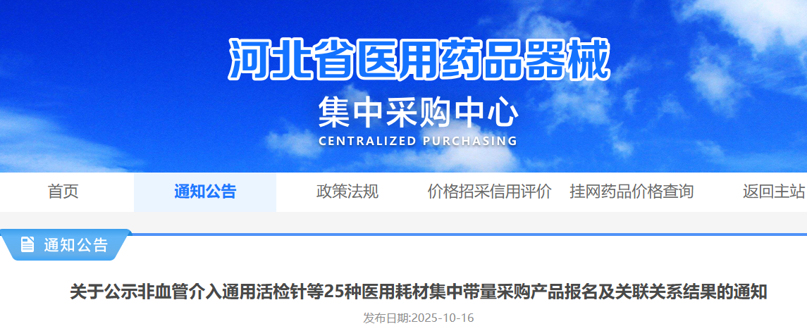 10月16日,河北省正式启动非血管介入通用活检针等25种医用耗材集中带量采购结果公示,公示期仅7天至10月22日结束。