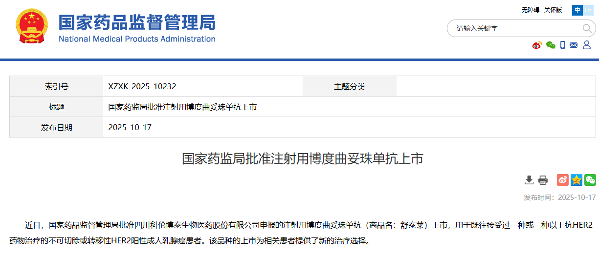 国家药品监督管理局官网发布重磅公告:四川科伦博泰生物医药申报的注射用博度曲妥珠单抗(商品名:舒泰莱)正式获批上市。这款新型ADC药物(抗体偶联药物)专门针对HER2阳性乳腺癌患者,填补了国内二线治疗领域的关键空白。