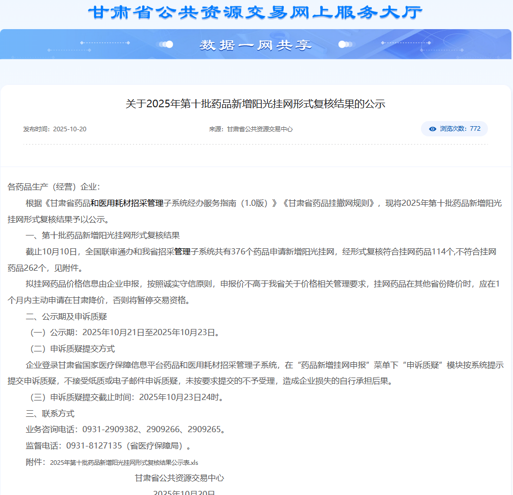 甘肃省医保局发布第十批药品新增阳光挂网形式复核结果公示,376个申报药品中仅114个通过形式审查,通过率不足三成。