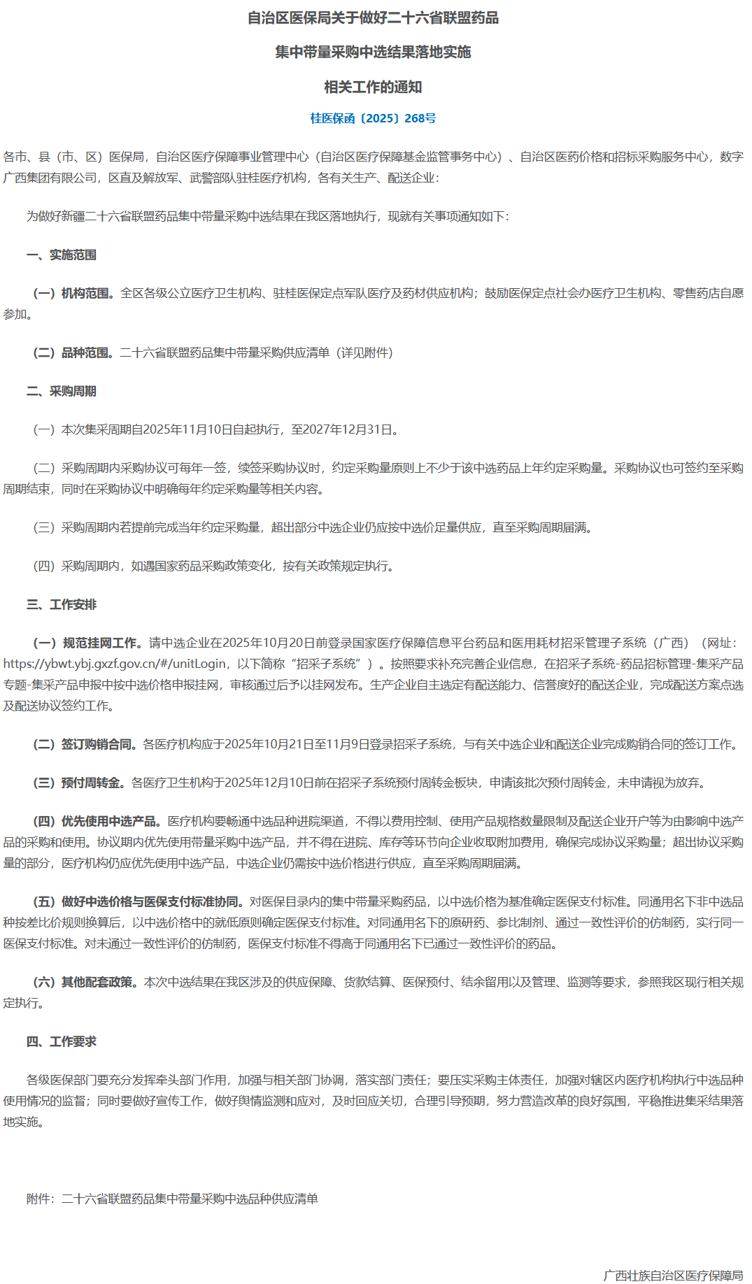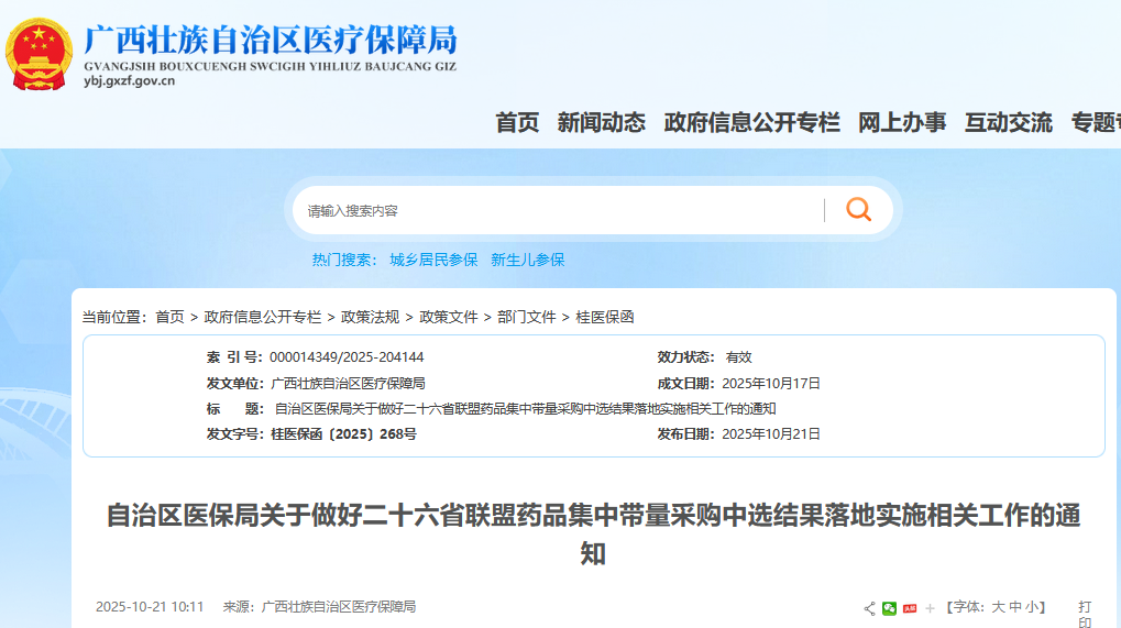 2025年10月21日,广西壮族自治区医保局正式发布通知,宣布二十六省联盟药品集中带量采购中选结果将在广西落地实施。