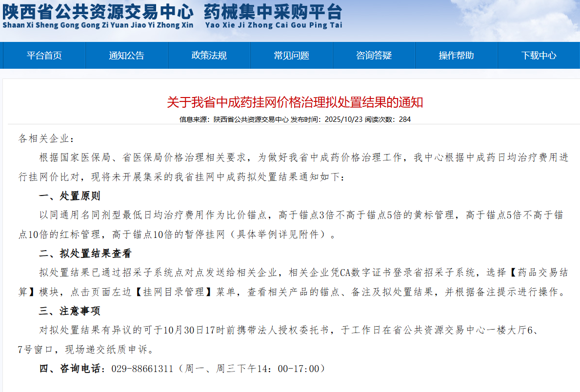 2025年10月23日,陕西省公共资源交易中心发布重磅通知,对省内未开展集采的挂网中成药启动价格治理拟处置程序。这是继国家医保局价格治理政策落地后,陕西省首次针对中成药挂网价格祭出分级管控措施,引发医药行业广泛关注。