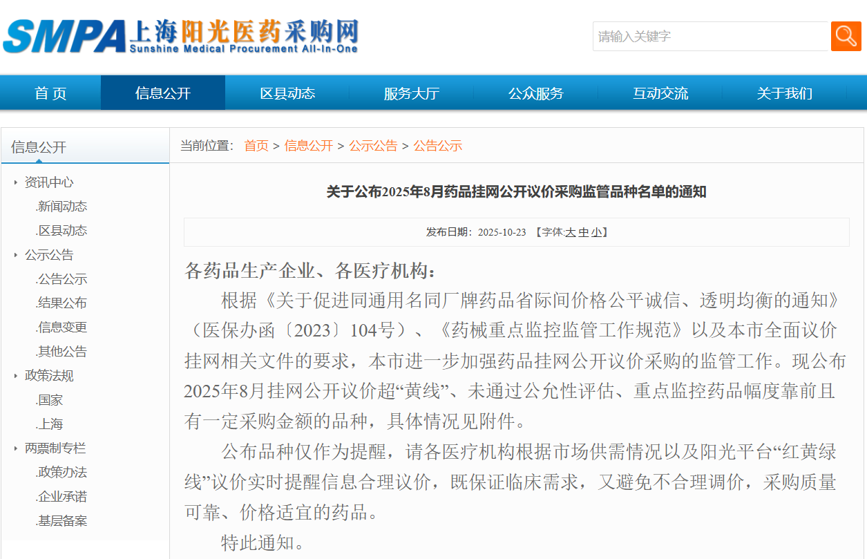 2025年10月23日,上海市医保局正式发布《关于公布2025年8月药品挂网公开议价采购监管品种名单的通知》,引发医药行业广泛关注。这份最新监管文件直指药品采购价格问题,剑指三类高风险药品,释放出强化医药市场价格监管的明确信号。