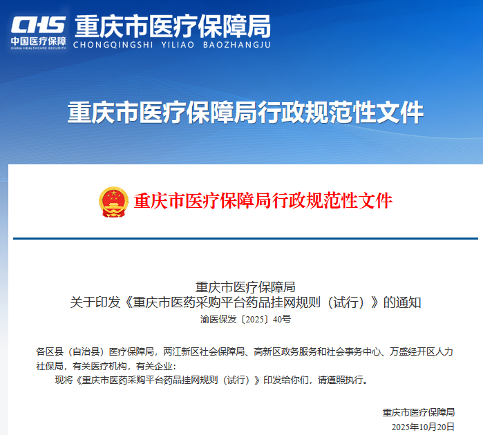 重庆市医疗保障局正式印发《重庆市医药采购平台药品挂网规则(试行)》,宣布自2025年12月1日起全面实施药品采购新机制。这份被业内称为"渝医保发〔2025〕40号"的文件,通过明确挂网主体责任、细化价格形成机制、强化价差管控等措施,构建起"企业自主定价+多维比价约束+动态风险监控"的新型药品采购体系。