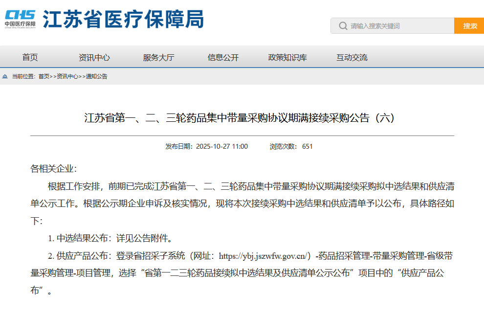 2025年10月27日,江苏省医保局正式发布《第一、二、三轮药品集中带量采购协议期满接续采购公告(六)》,标志着历时数月的集采接续工作进入落地阶段。