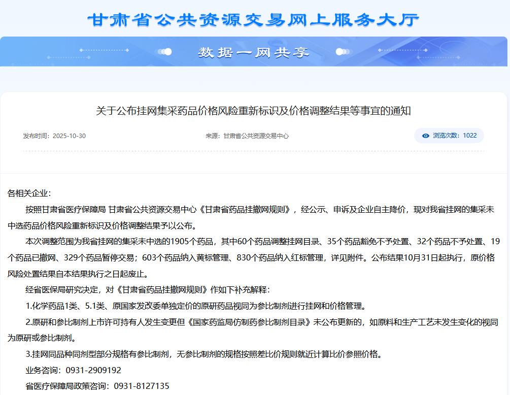 | 2025年10月30日,甘肃省医疗保障局与省公共资源交易中心联合发布重磅通知,1905个集采未中选药品将从明天(10月31日)起全面执行新的价格风险标识管理。 附件:集采药品价格风险重新标识及价格调整结果一览表.xls