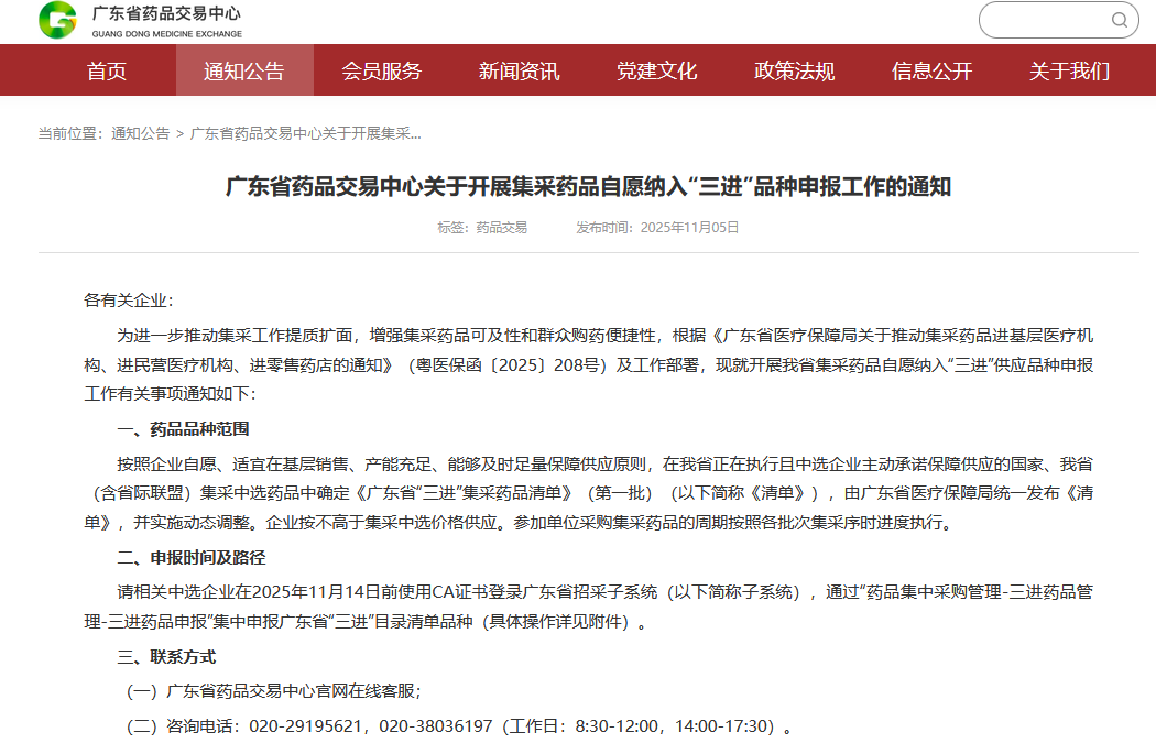 申报路径:企业使用CA证书登录广东省招采子系统,通过"药品集中采购管理-三进药品管理-三进药品申报"模块进行操作(具体流程详见通知附件)。
