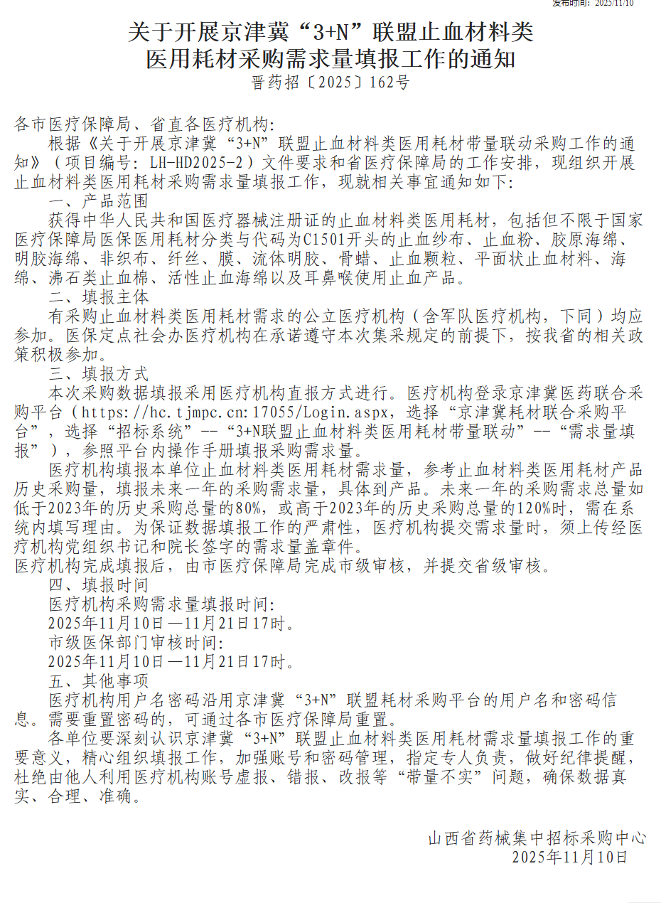 京津冀“3+N”联盟正式启动止血材料类医用耗材采购需求量填报工作!这场覆盖三地数百家医疗机构的集采行动,将直接影响未来一年止血材料的采购价格和市场格局。所有相关医疗机构必须在11月21日17时前完成数据提交。