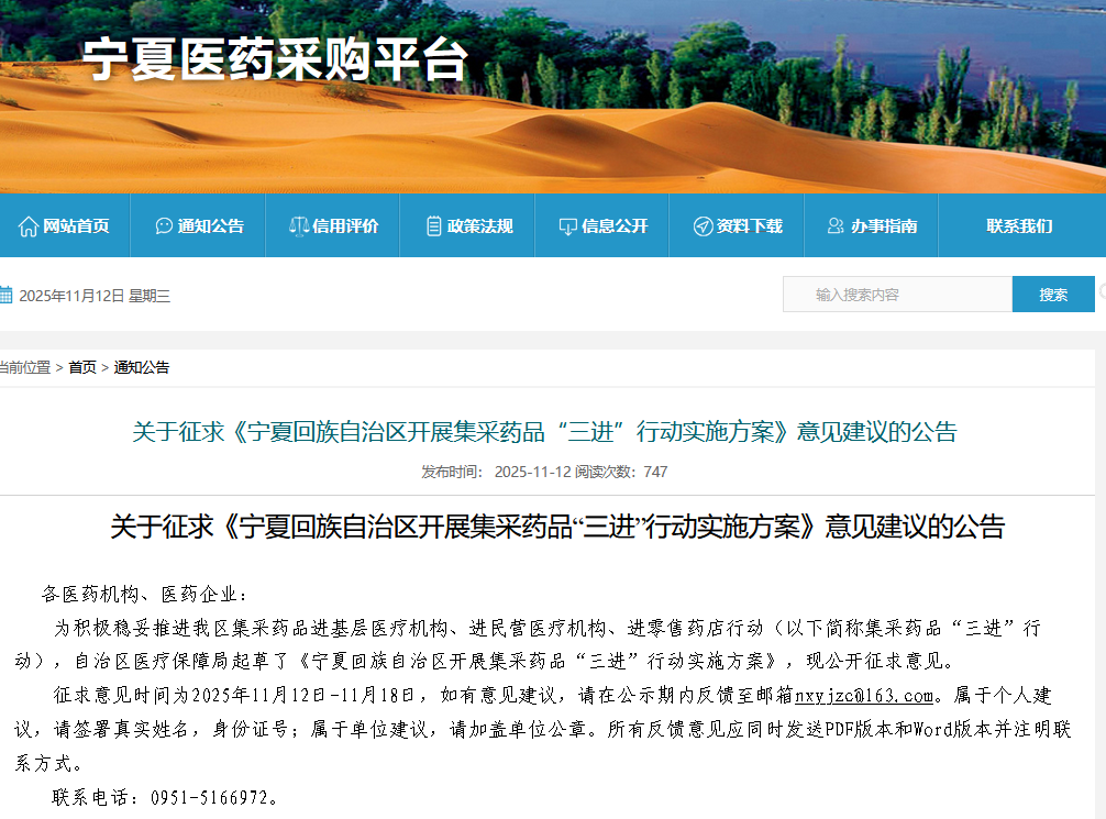 2025年11月12日,宁夏发布《集采药品"三进"行动实施方案》,明确基层药店、民营医院等机构将可提供降价50%以上的集采药。