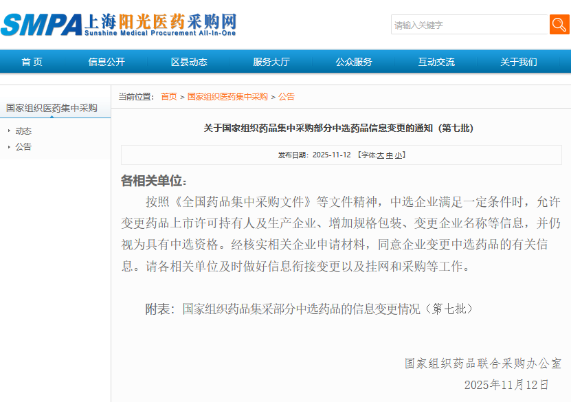 2025年11月12日,国家组织药品集中采购办公室发布通知,允许第七批中选药品在满足特定条件下变更核心信息,这是集采政策实施以来首次明确中选药品的动态调整机制。