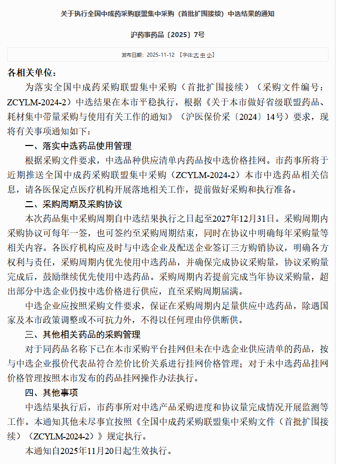 今天,上海市药事所发布《关于执行全国中成药采购联盟集中采购(首批扩围接续)中选结果的通知》(沪药事药品〔2025〕7号),标志着中成药集采扩围政策进入实施阶段。