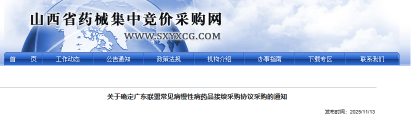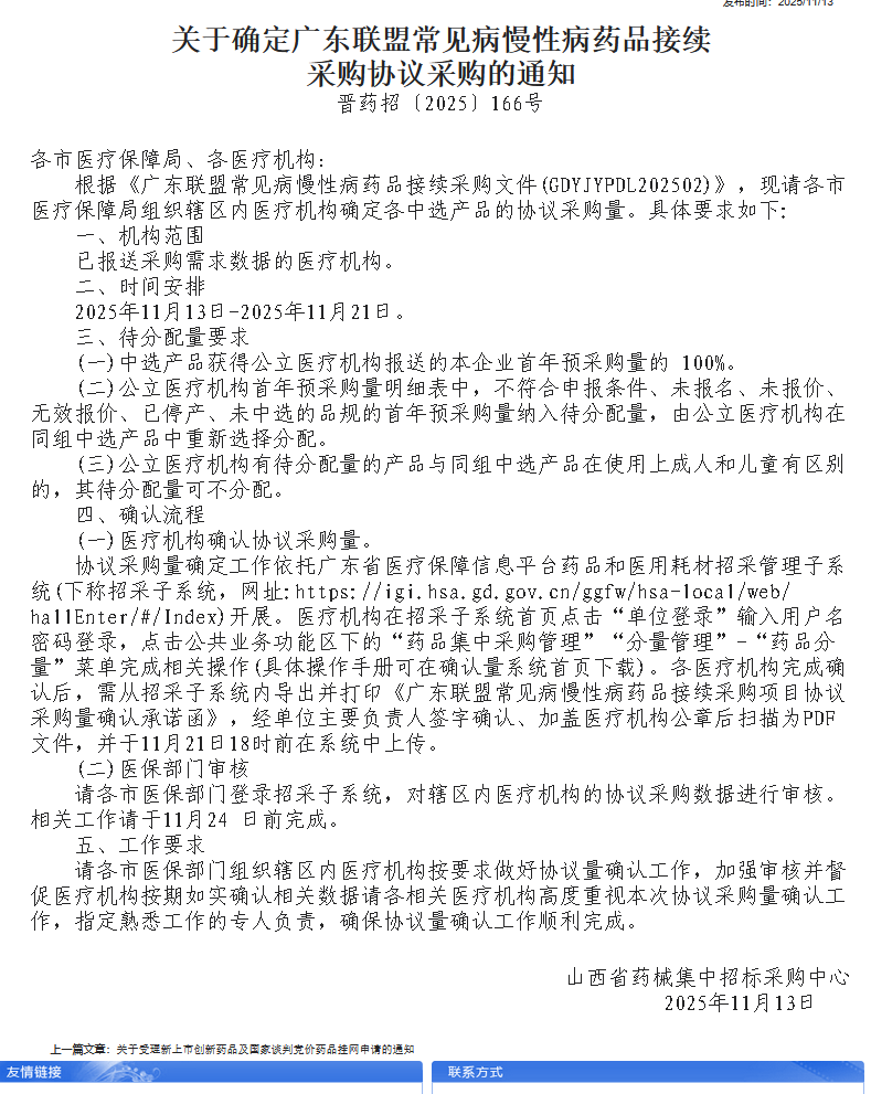 2025年11月13日,山西省医疗保障局下发通知,要求全省已报送采购需求数据的医疗机构,在11月13日至11月21日期间完成广东联盟常见病慢性病药品接续采购的协议采购量确认工作。