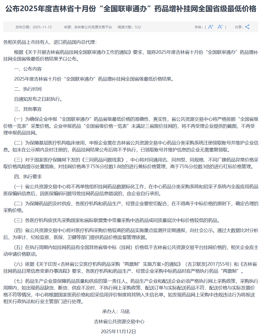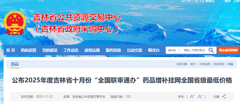 吉林省公共资源交易中心发布公告,正式公布2025年度十月份"全国联审通办"药品增补挂网全国省级最低价格结果。公告明确了相关药品的挂网价格执行标准及配套管理措施。
