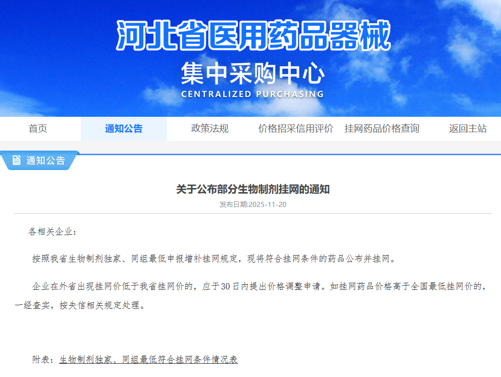 2025年11月20日,河北省医保局发布《关于公布部分生物制剂挂网的通知》,对生物制剂挂网作出明确规定,主要内容包括挂网药品范围、价格调整时限及失信处理措施