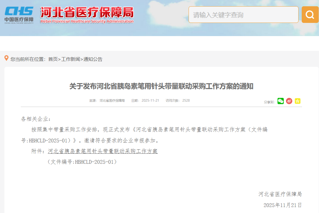 河北省医疗保障局正式发布《河北省胰岛素笔用针头带量联动采购工作方案》(文件编号:HBHCLD-2025-01),标志着这项关乎糖尿病患者用药负担的重要政策进入实施阶段。