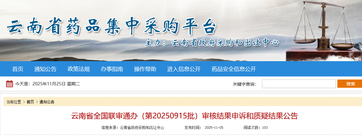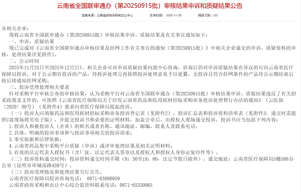 2025年11月25日,云南省政府采购和出让中心发布全国联审通办(第20250915批)申诉质疑结果公告,明确企业投诉权利和操作路径。
