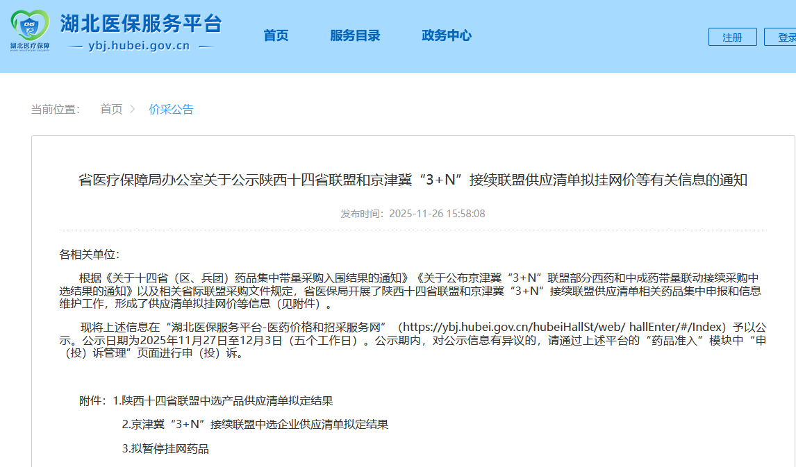 公示时间将从2025年11月27日正式开始,至12月3日结束,共计5个工作日。湖北省医保局特别强调,所有相关信息已上传至“湖北医保服务平台-医药价格和招采服务网”(https://ybj.hubei.gov.cn/hubeiHallSt/web/hallEnter/#/Index),企业可通过官方渠道实时查询具体药品的拟挂网价格。