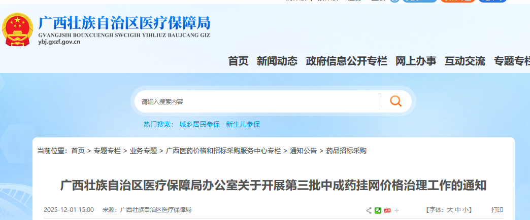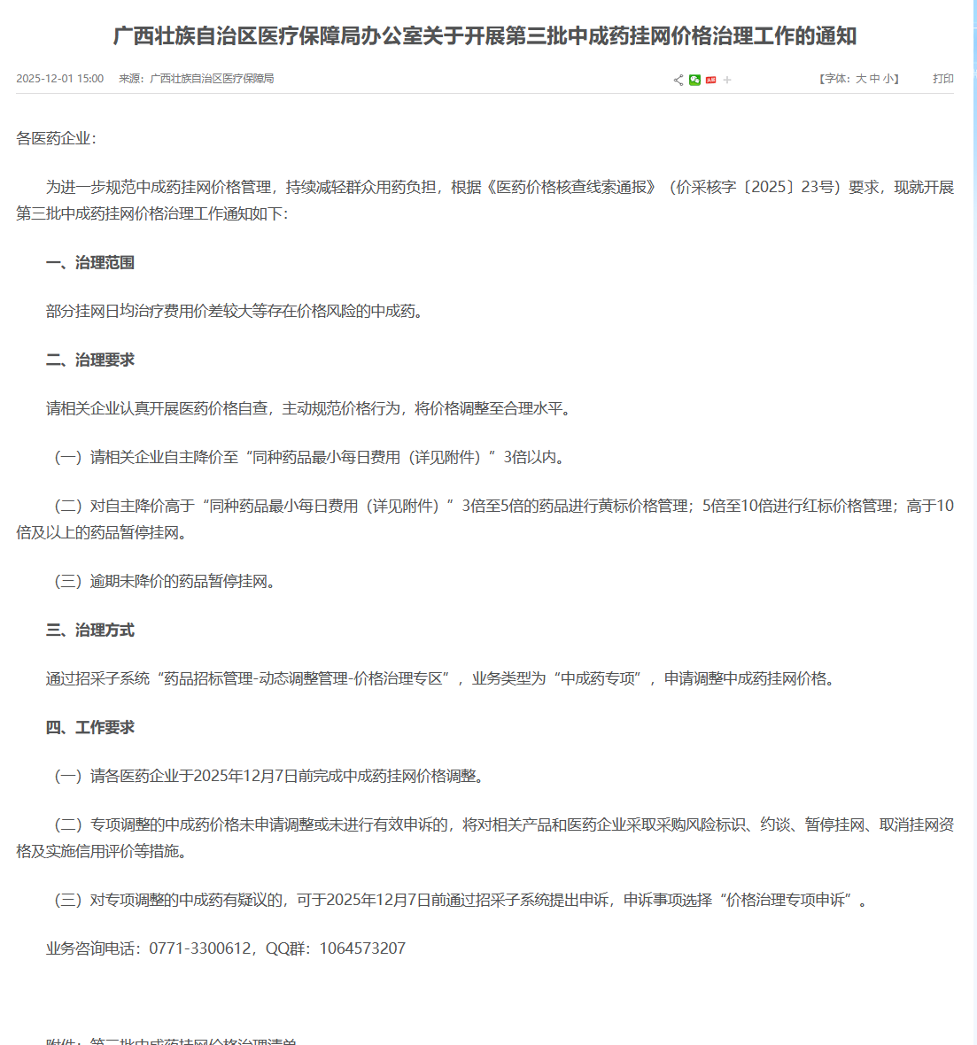 2025年12月1日,广西壮族自治区医疗保障局启动第三批中成药挂网价格治理工作,要求相关药企在6天内完成价格调整,逾期将暂停挂网。