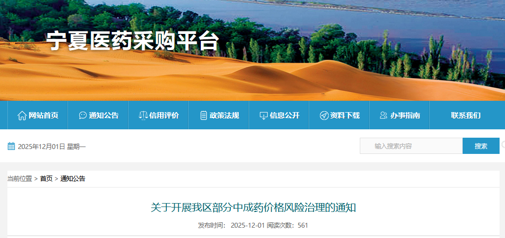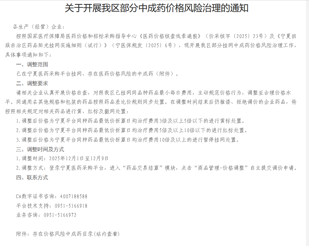 2025年12月1日,宁夏回族自治区医保局发布《关于开展我区部分中成药价格风险治理的通知》,启动全区部分挂网中成药价格风险治理工作。