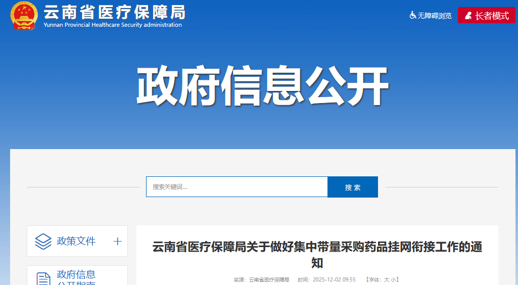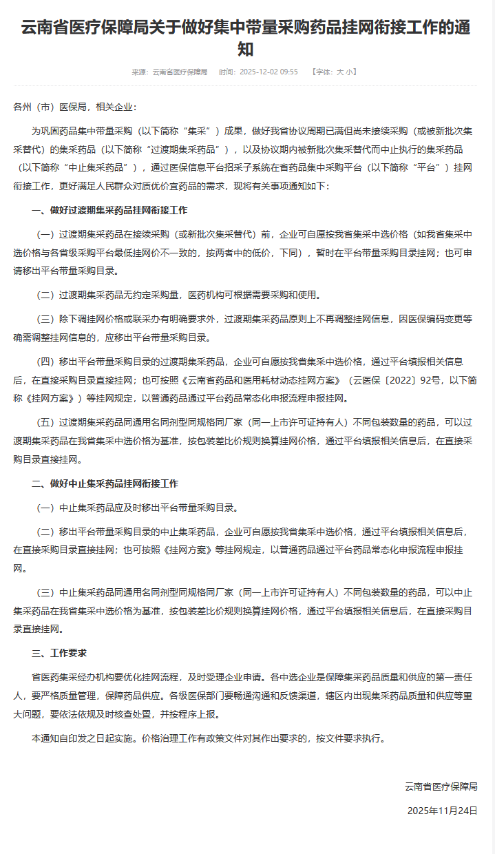 2025年12月2日,云南省医疗保障局发布《关于做好集中带量采购药品挂网衔接工作的通知》,针对过渡期及中止集采药品挂网规则进行重大调整,涉及全省患者用药保障及医药企业市场策略。