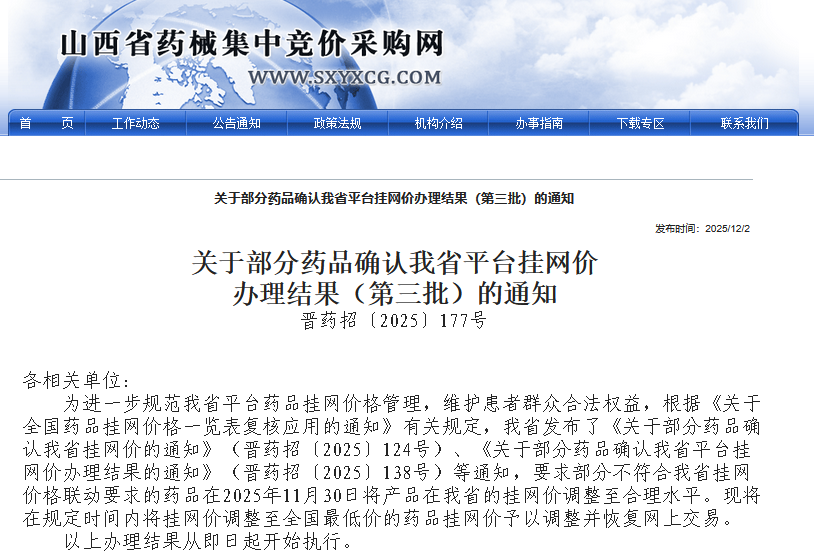 按时完成降价的药品已从12月3日起恢复网上交易。这是山西省继晋药招〔2025〕124号、138号文件后,第三次规范药品价格的重要举措。