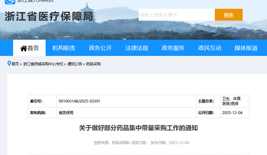 2025年12月4日,浙江省医保局发布《关于做好部分药品集中带量采购工作的通知》,明确将五批药品集采品种同步纳入执行范围,执行时间为12个月。