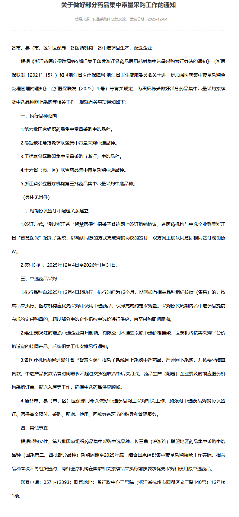 本次采用网上签约方式,医药机构与中选企业通过浙江省"智慧医保"招采子系统确认同意即完成购销协议签订。签约时间为2025年12月4日至2026年1月31日。
