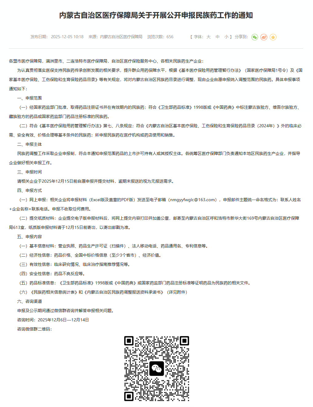 内蒙古自治区医疗保障局发布重磅通知,正式启动民族药公开申报工作。这是继国家医保目录调整后,地方民族药保障体系的一次重要升级。