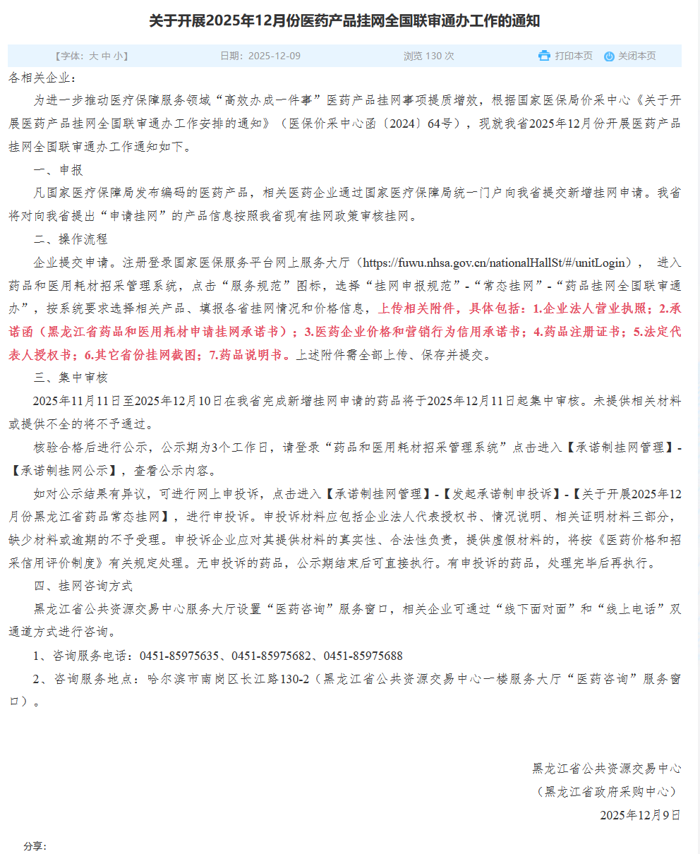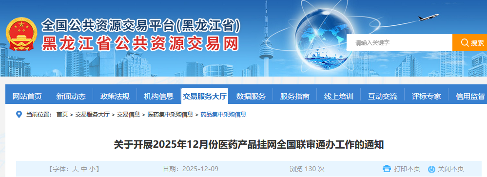 12月9日 黑龙江医药产品挂网全国联审通办12月启动! |