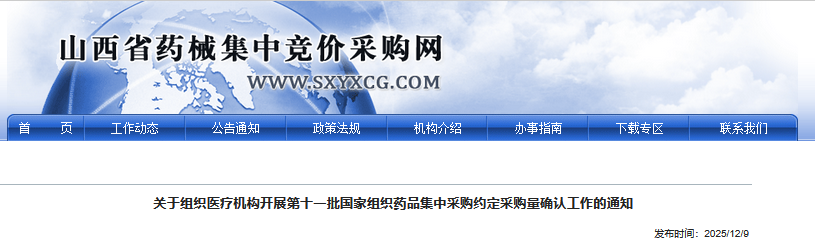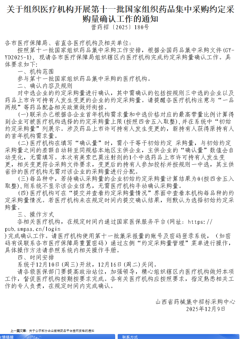2025年12月9日,山西省医疗保障局发布通知,要求全省医疗机构在一周内完成第十一批国家组织药品集采的约定采购量确认工作,该工作将直接影响明年药品供应价格和质量。