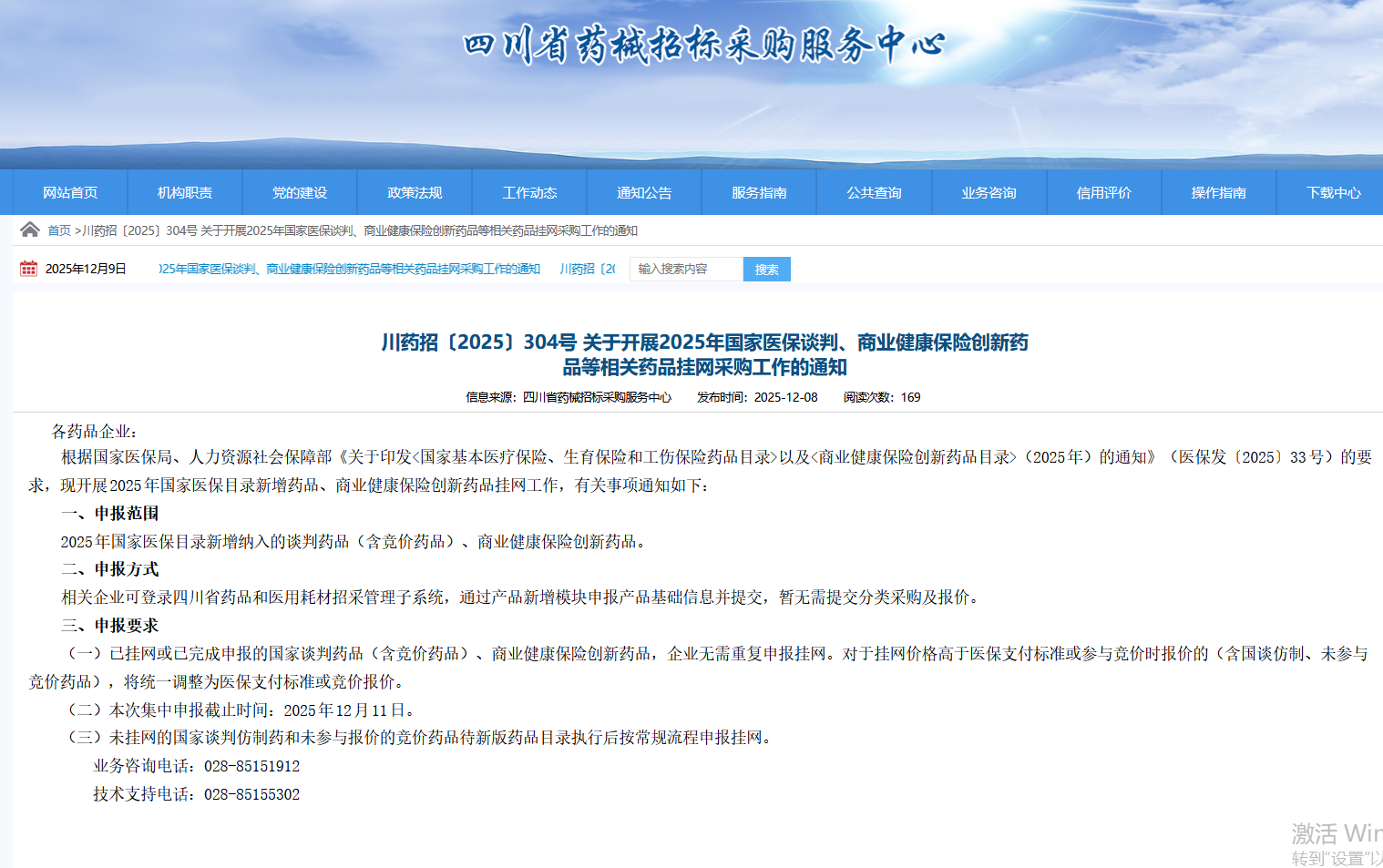 四川省药械招标采购服务中心紧急发布川药招〔2025〕304 号通知,正式启动 2025 年国家医保谈判药品和商业健康保险创新药品的挂网采购申报工作。