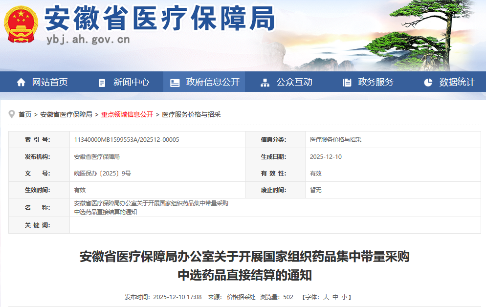 安徽省医疗保障局宣布,12月15日起正式实施国家组织药品集中带量采购中选药品直接结算,将给医药采购和医保结算带来重大变革。