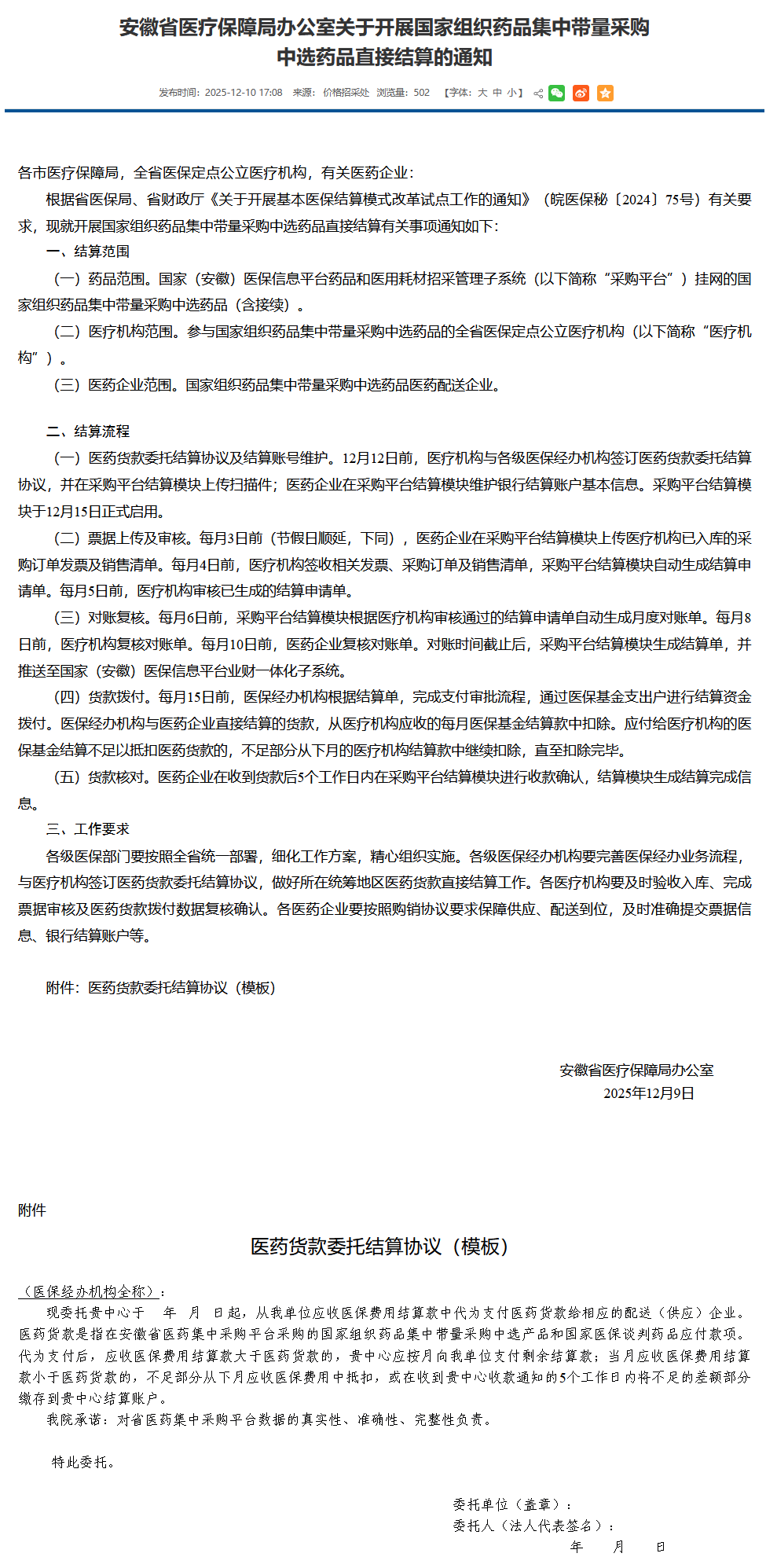 新政明确三大结算范围: - 药品范围:国家(安徽)医保信息平台挂网的国家集采中选药品(含接续品种) - 医疗机构范围:全省参与集采的医保定点公立医疗机构 - 医药企业范围:集采中选药品的医药配送企业