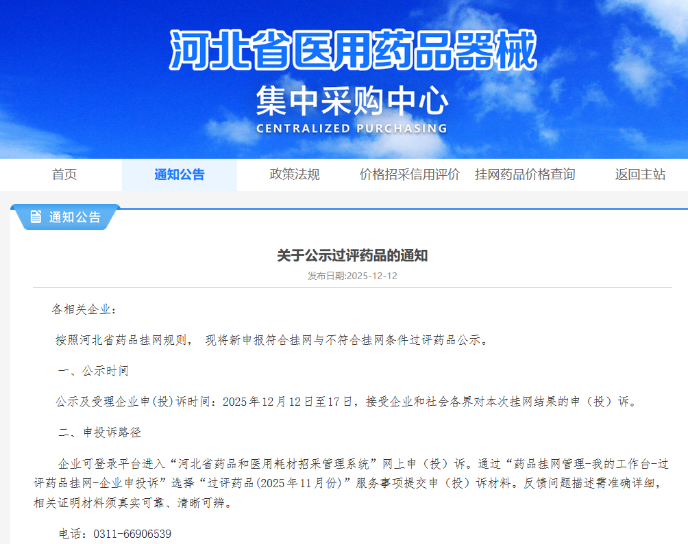 咨询热线:0311-66906539,工作日9:00-11:30、14:00-17:00受理。本次公示涉及2025年11月份申报的过评药品。