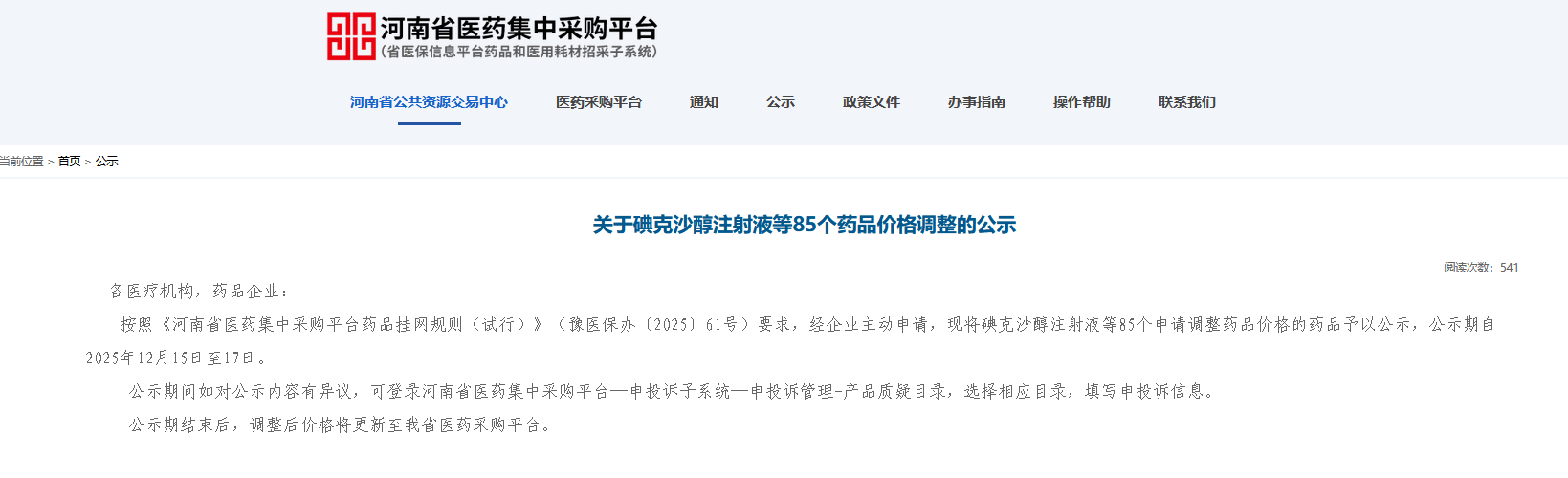 河南省医保局发布公告:碘克沙醇注射液等85种药品价格调整方案进入公示期,公示期仅3天!