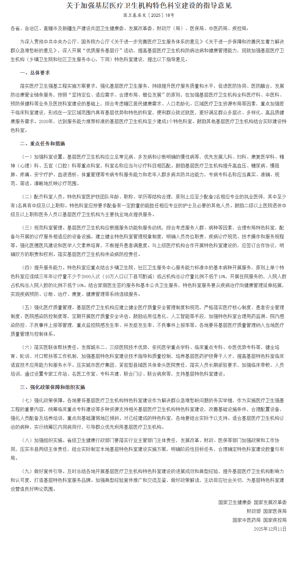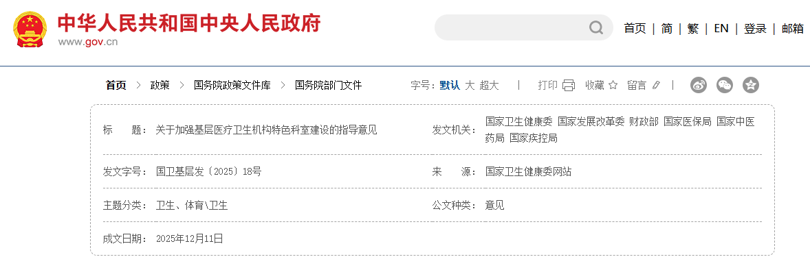 国家卫健委联合多部门发布《关于加强基层医疗卫生机构特色科室建设的指导意见》(国卫基层发〔2025〕18号),明确提出到2030年,所有达到服务能力推荐标准的基层医疗卫生机构必须建成至少1个特色科室。