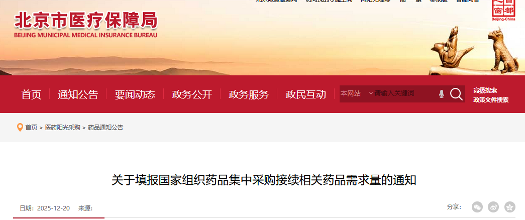 北京市医保局发布通知,正式启动国家组织药品集中采购接续报量工作。