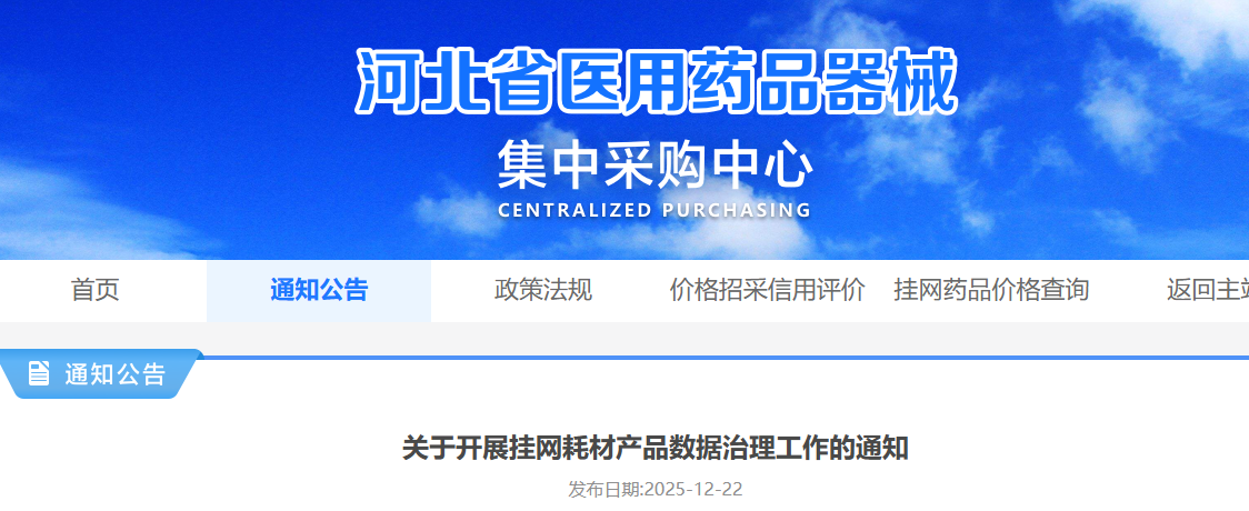 河北省医保局发布《关于开展挂网耗材产品数据治理工作的通知》,整改窗口期为2025年12月22日至2026年1月20日。