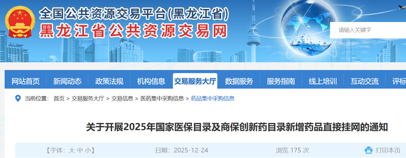 黑龙江开展2025年基本医保药品目录及商保创新药目录药品在我省直接挂网工作,2025年12月25日前直接挂网。