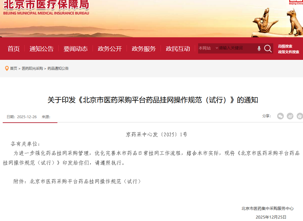 北京市医保局发布《北京市医药采购平台药品挂网操作规范(试行)》,从申报主体到价格管理明确12条核心规则。